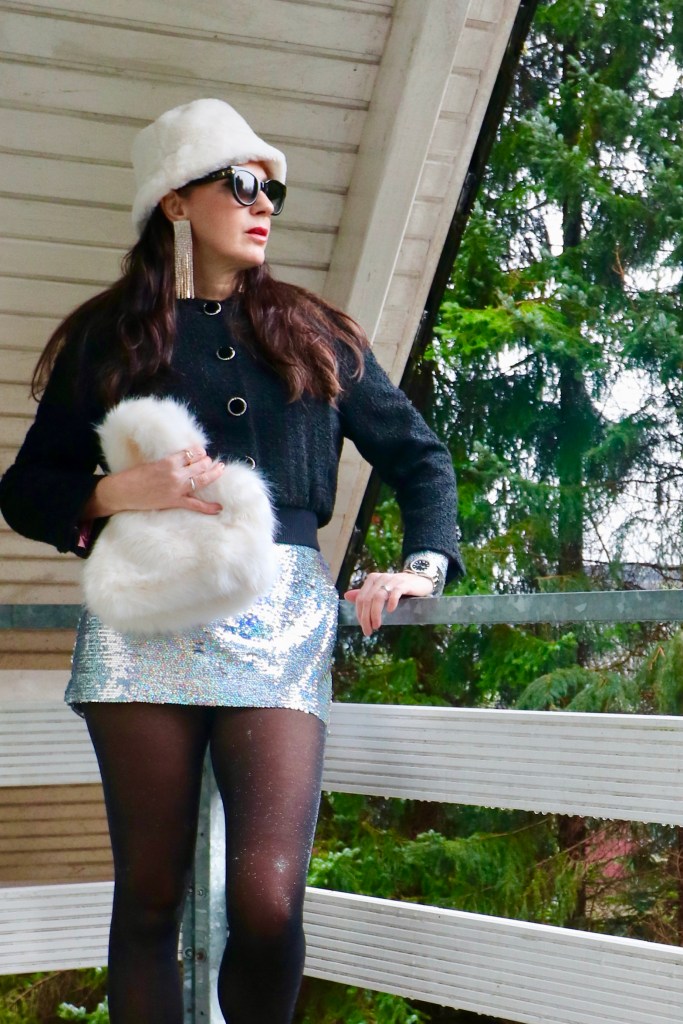 The dress with shiny silver sequins rounds off the party style. The look is a style that can also be combined. I was thinking especially of the winter vacation in the mountains, a really nice warm outfit, and just great. The fake fur hat and bag are also nice …..